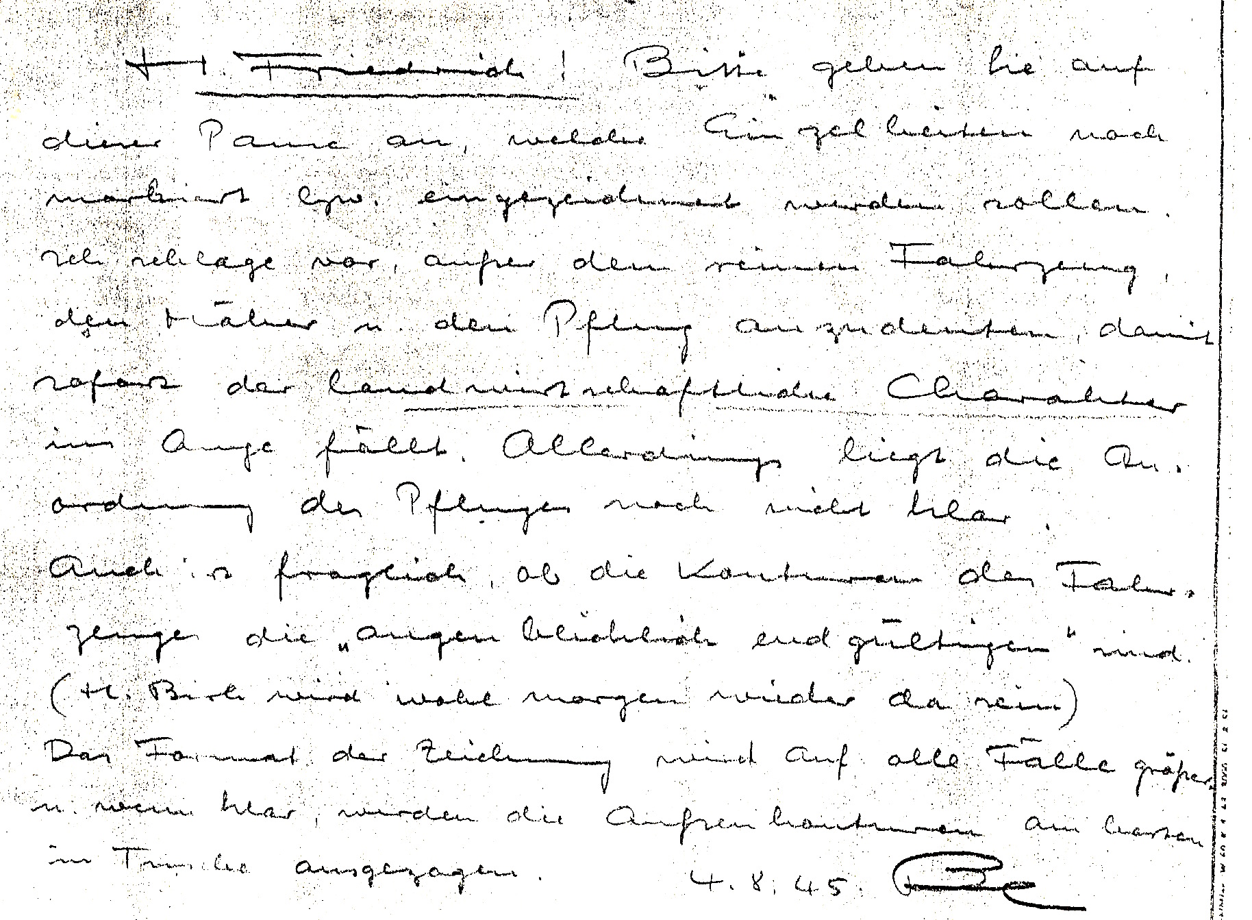 Vielleicht wird es auch notwendig sein, H. Grass als landwirtschaftlichen Experten in irgendeiner Form aufzunehmen. Zunächst ist aber die Lage so, dass H. Friedrich noch der Fa. Daimler-Benz angehört; auch hat die Fa. Daimler-Benz vorläufig noch einige Vorrechte auf die Konstruktion. Bis jetzt hat sich allerdings H. Direktor Haspel ablehnend verhalten, da er immer noch an das Aufleben des Personenwagenbaues glaubt.