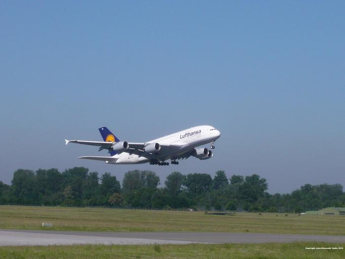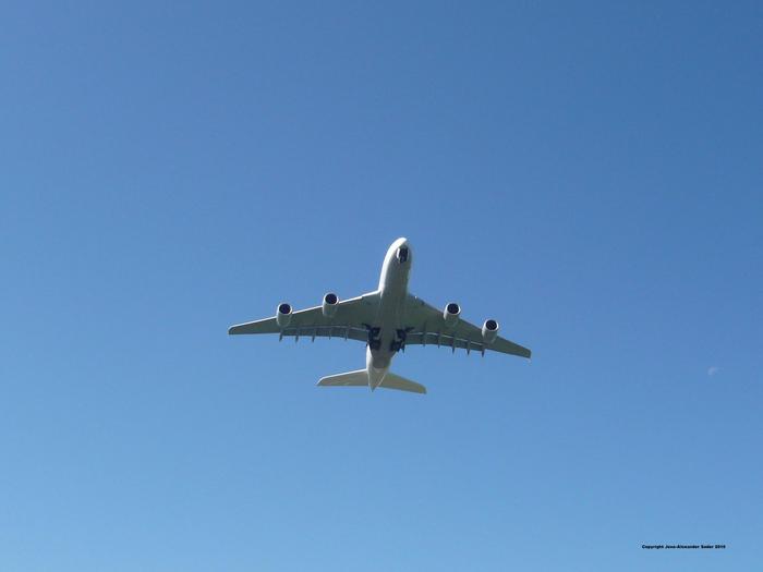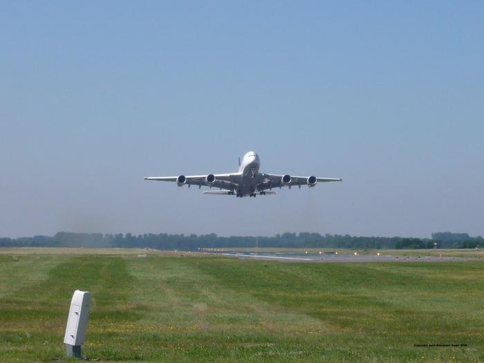 letzten Freitag war bei uns aufm Baden-Airpark in Rheinmünster-Söllingen der A380-841 (der mit den Rolls-Royce-Trent-900 Triebwerken) bei Touch&Go Übungen zu sehen. Das hab ich mir nicht nehmen lassen da das Wetter sehr gut war (besser wie Montags). Der Airbus flog von Süden her auf den Flughafen (da der Wind aus Norden kam, am Montag flog der Airbus ausm Norden rein) ein. Da ich leider nur ne Digi-Cam habe konnte ich nur gescheite Bilder machen wenn er recht nahe zu mir war