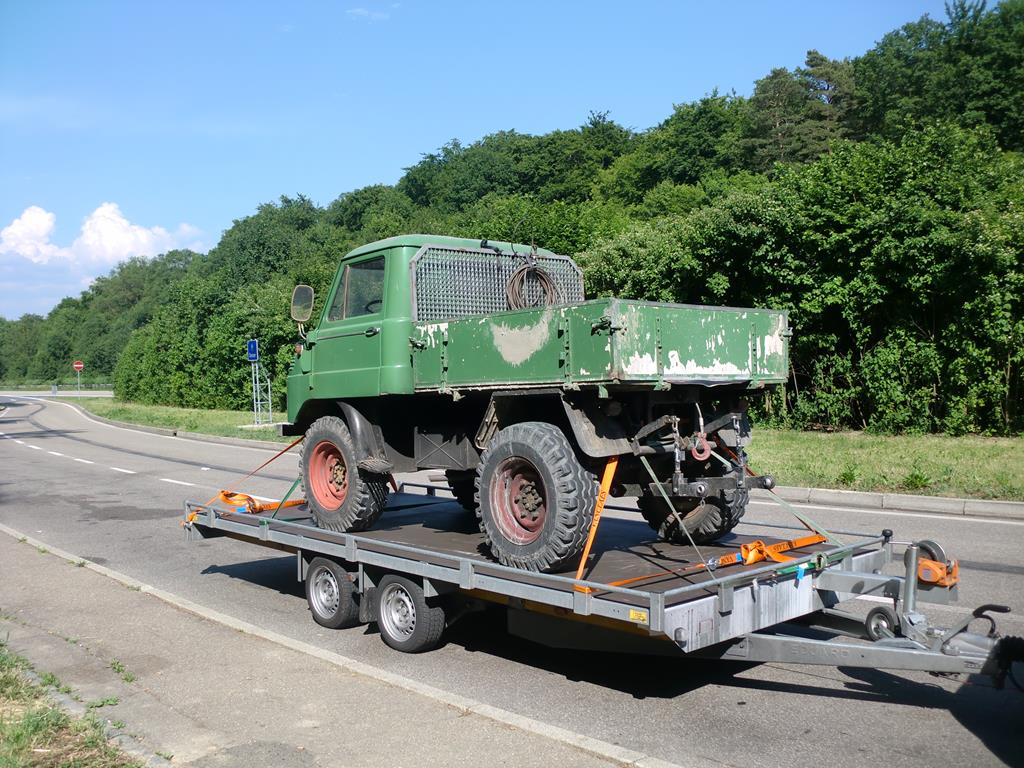 Dieses Bild zeigt den Unimog nach der Verladung in Bayern