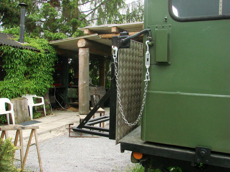 Hintendran, außen vor den Türen, eine Plattform zum senkrecht hochstellen mit 2 Reserverädern. Das wird Terasse werden. Soll auch mit der Winde geklappt werden.