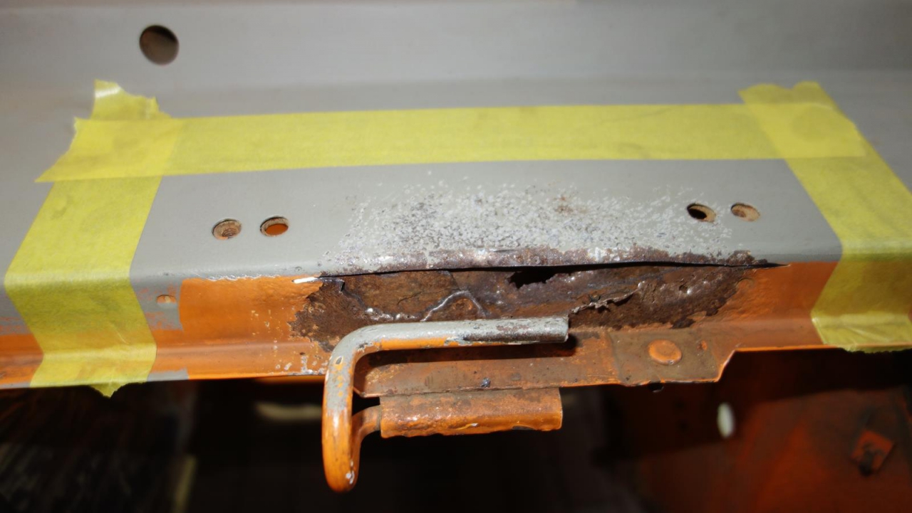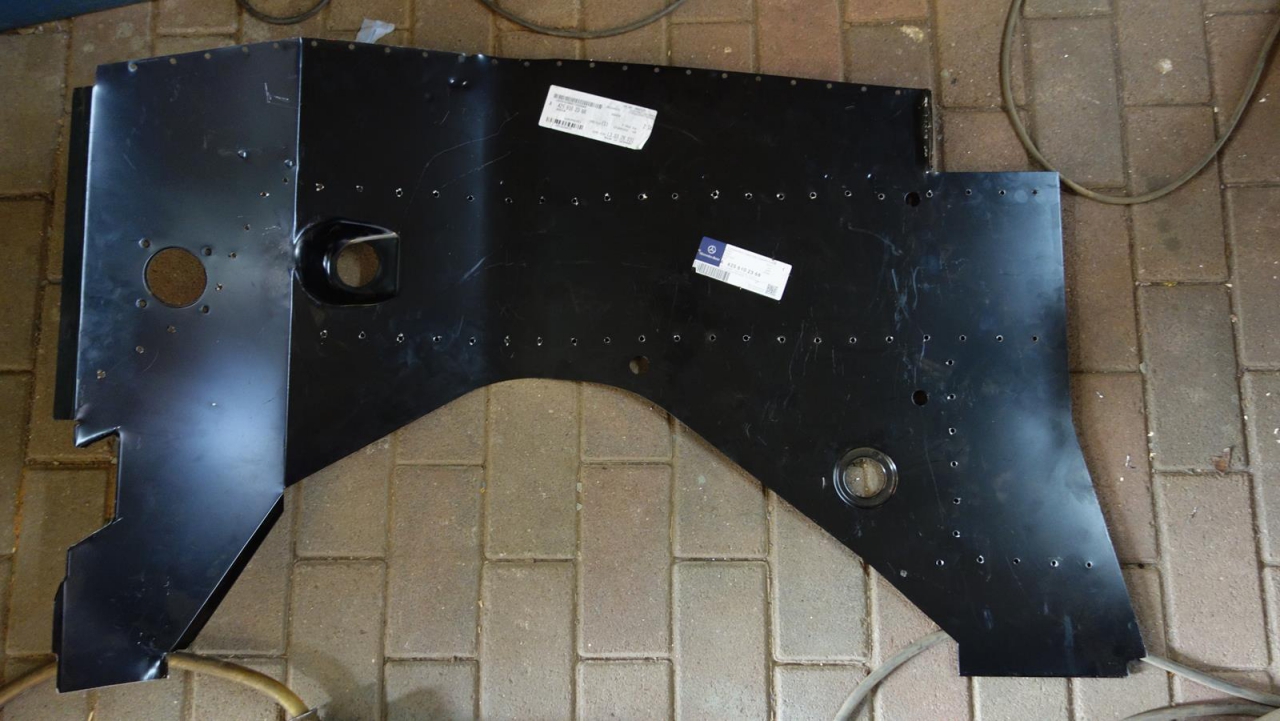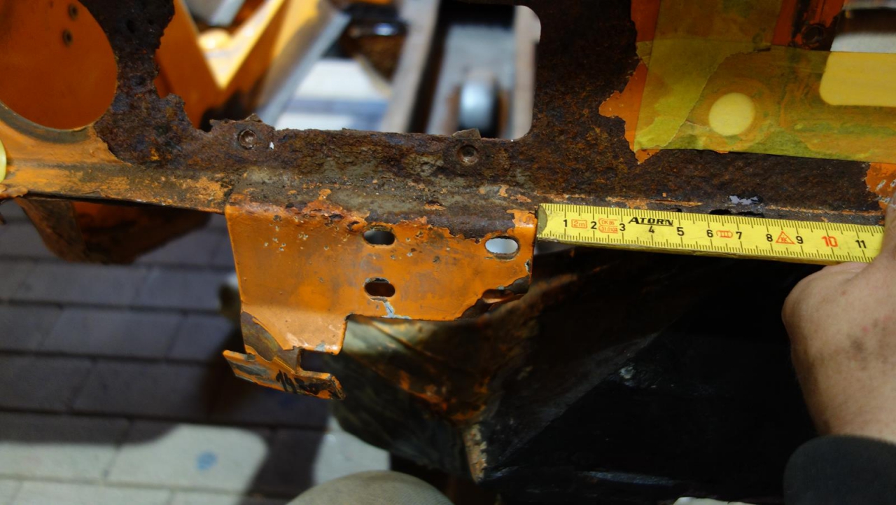 Die nächste Baustelle ist das Frontblech vor dem Fahrerfußraum. Hier hat der Rost auch schon ziemlich gewütet. Zu sehen ist hier auch die geklebte Trennmarkierung.