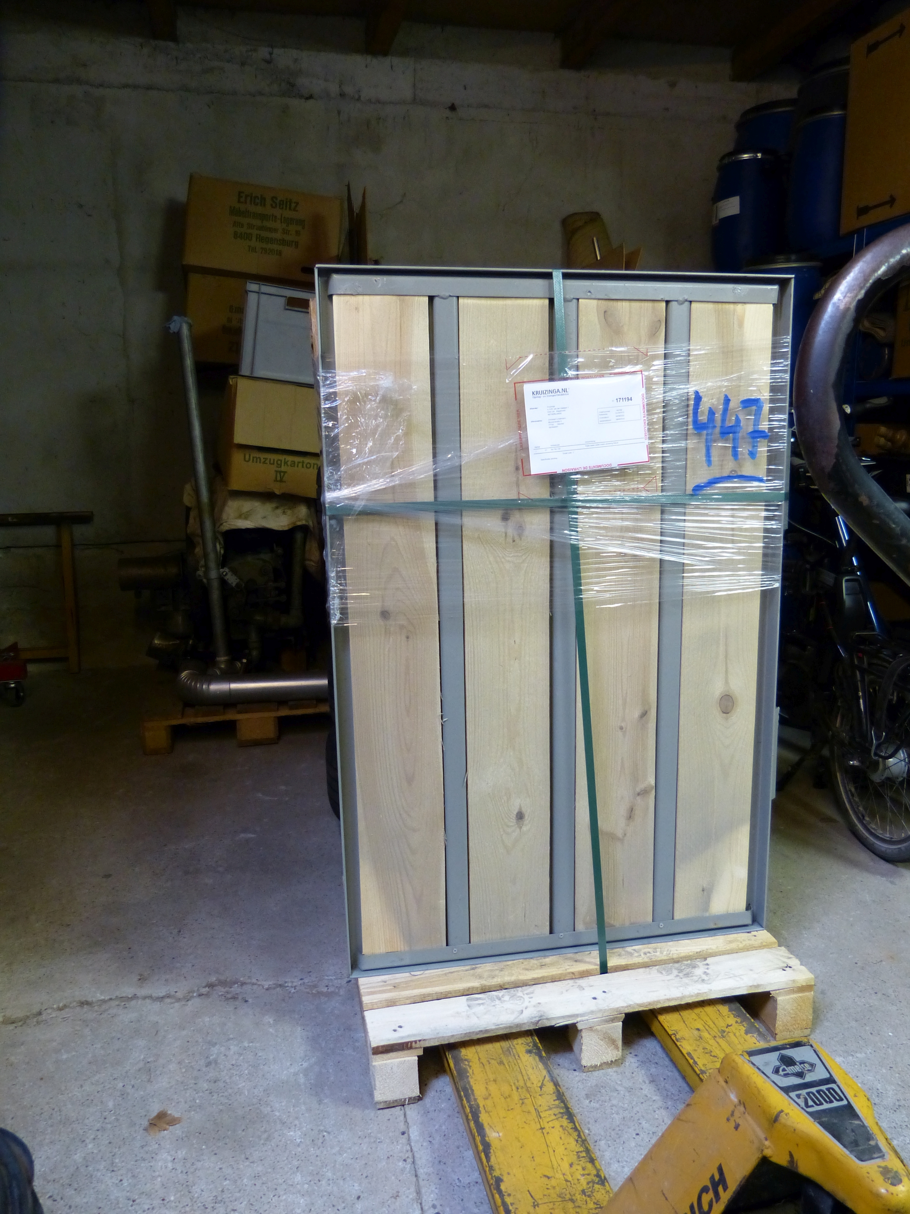 Heute ist schon die Stahlpalette als "Fundament" für det janze gekommen. Die Transportkosten aus Holland waren höher als der Preis für die Palette selber. (Das Bild lässt sich ums Verrecken nicht drehen.)