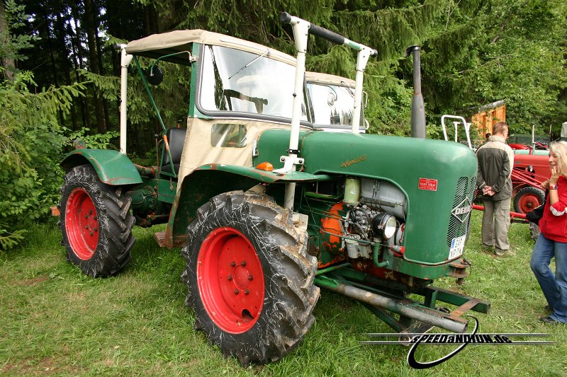 Mit Deutz liegt ihr garnicht so verkehrt, denn in dem Schlepper werkelt tatsächlich ein Deutz F4L914. Der der lange senkrechte hebel links im Bild ist übrigens der Hebel für das Wandlergetriebe. Man kann den Schlepper damit ohne Kupplung in allen 6 Gängen Vorwärts und Rückwärts schalten bzw ohne Kuplung das Zwischengetriebe Schalten. Spätestens jetzt dürfte der Groschen gefallen sein. Wenn ich noch einen Hinweis geben darf, die Schlepper dieser Baureie wurden in der Regel in Rot ausgeliefert, nur einige wenige im dem gezeigten Grün.
