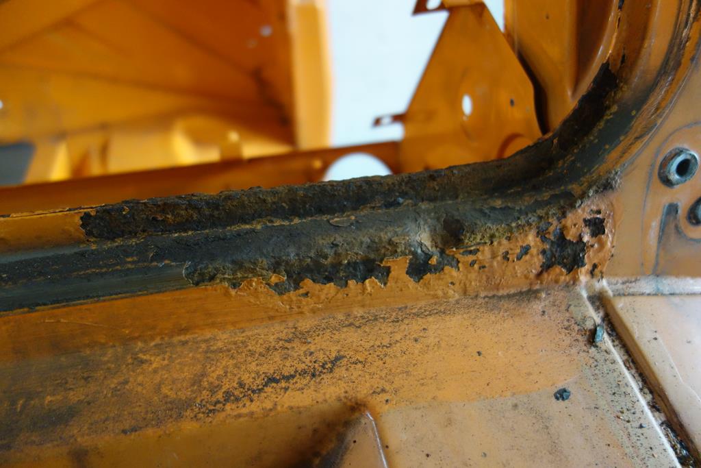 Der Falzrost an der Rückseite der Kabine sieht schon beeindruckend fortgeschritten aus. Klar ist hierbei, dass fast ringsum Bleche ersetzt werden müssen. Die Hoffnung, dass große Teile der Außenbeblechung der B-Säule erhalten bleiben können ist noch vorhanden, auch wenn der Rost durch das Aufquellen bereits kleine Krater in das Außenblech zieht, an den Stellen, die von den Punktschweißnähten gehalten werden.