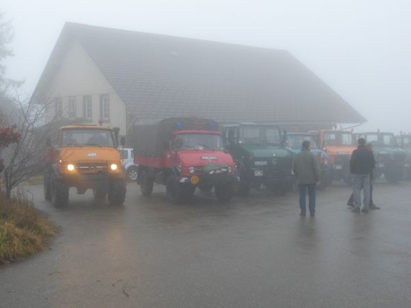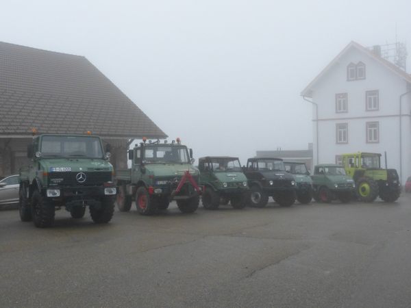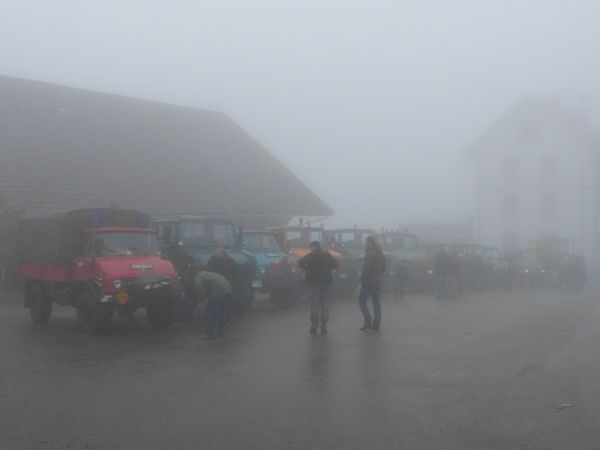 trotz ungünstiger Wetterlage machen sich elf Unimog und ein MB trac an den Aufstieg auf den 1165 m ü. NHN hohen Hochblauen, den Hausberg des Markräflerlands.