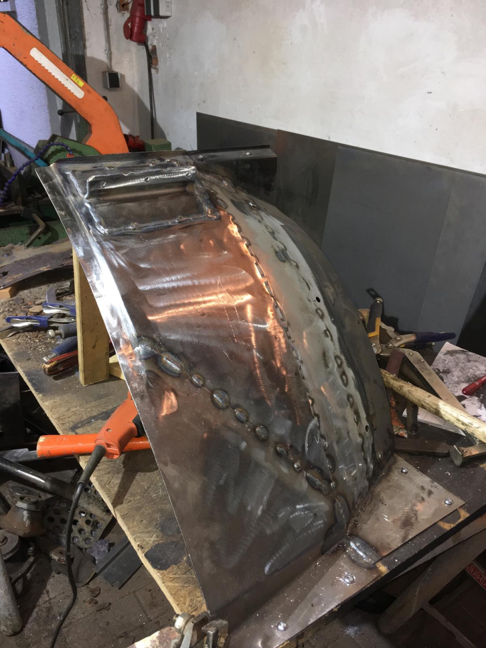 Die Stellen, die zu spachteln sind, werden mit Schwemmzinnersatz hergestellt. Das Dachblech, das sich beim Schweißen etwas verworfen hatte, wird vorher auch noch vom Karosseriebauer gerichtet.