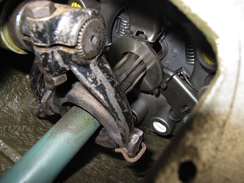 Getriebewelle in Kupplungsscheibe eingeführt, dank Zentrierdorn gleitet die Welle fast mühelos in die Verzahnung.