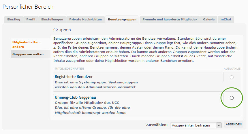Anschließend auf den Reiter "Benutzergruppen" klicken und unten rechts (da wo ich den grünen Kreis gemacht habe) klicken und anschließend auf den Absenden Button - Fertig !