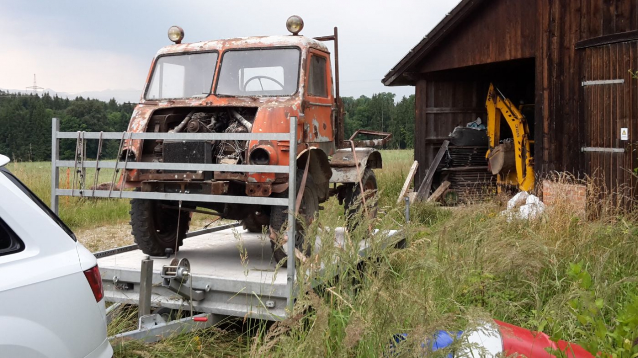 Der restaurierte Erstmog und ein Dieseli standen inzwischen bei mir in der Garage, die ich mir beim Hausumbau gegönnt habe. Den Anhänger brachte ich nach einer Aufräumaktion noch in der Garage unter, aber für den Forstmog hätte ich weder Platz noch die nötige Einfahrtshöhe von 2,75 m gehabt. Also Überführung nach Ingolstadt, wo ich einen weiteren Stadel für 2 andere UNIMOGs hatte. Dort gab es erstmal Bremsausfall und dann noch mächtig Knatsch mit dem Vermieter, dann erneuter Standortwechsel zu einem UNIMOG-Kollegen, bei dem wir auch die Brems in Stand gesetzt haben, danach Anmiete einer Stellplatzes in Königsdorf und wieder 140 km Überführungsfahrt zurück….. Ihr merkt schon, das ging in die Zeit, ohne dass ich inhaltlich voran kam.