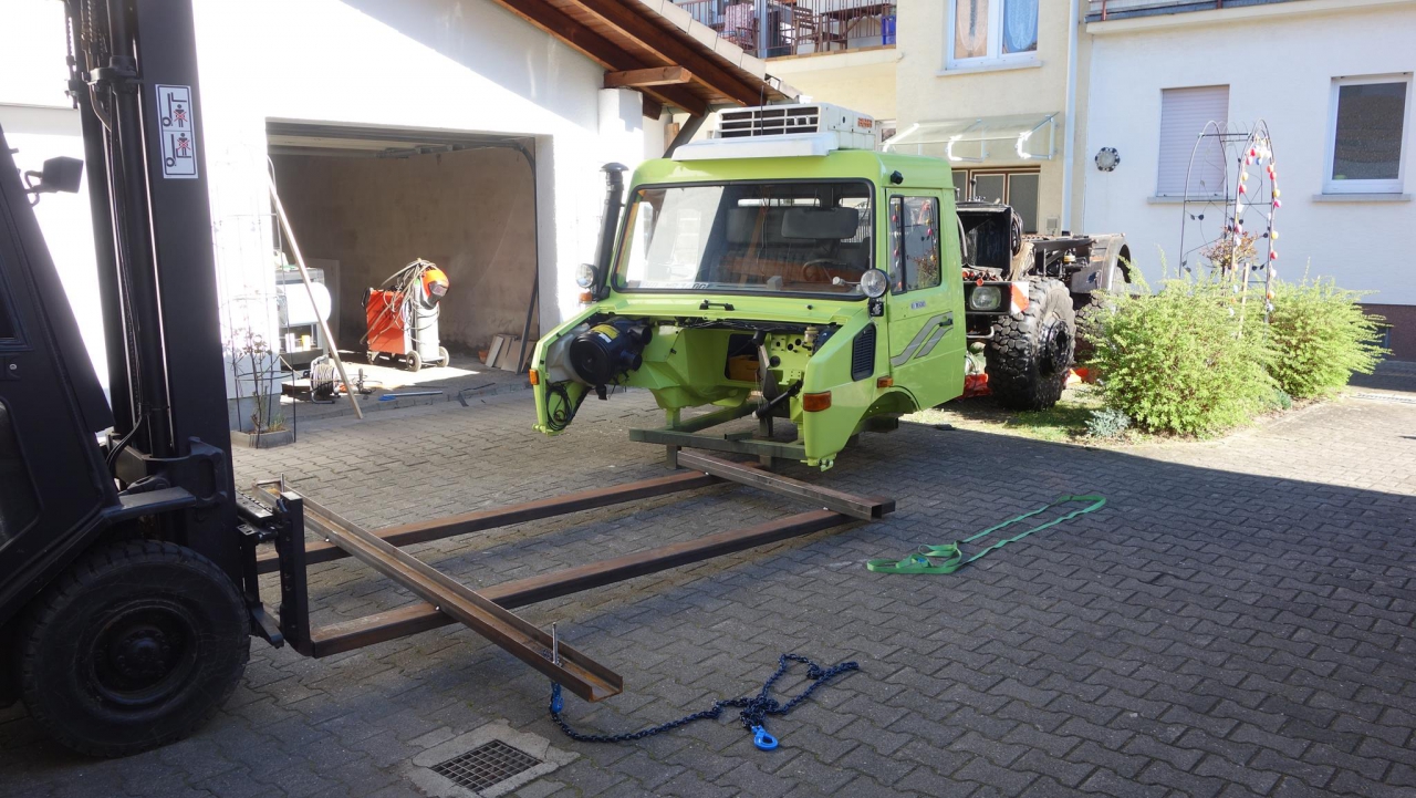 mittlerweile habe ich das Fahrerhaus mit dem Fahrgestell "verheiratet". Hierzu habe ich mir ein Hebegestell zusammengeheftet und das Fahrerhaus mit Ketten und Gurten daran befestigt.