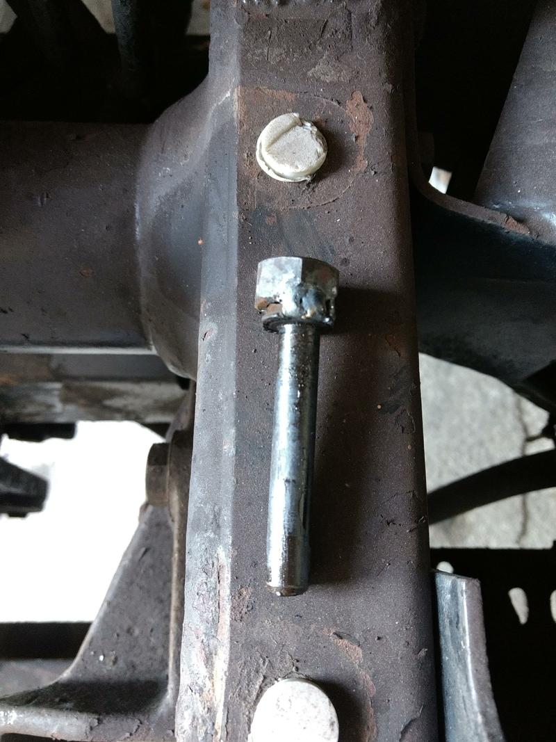 Links hat sich bisher der Stoßdämpfer an der unteren Schraube noch nicht ausbauen lassen. Die Mutter ist los, nur lässt sich die Schraube nicht rausdrücken. Wenn ich diese mit dem Schraubenschlüssel drehe, dann dreht sich das Gummilager des Stoßdämpfers mit. Das scheint also fest auf der Schraube zu sitzen.