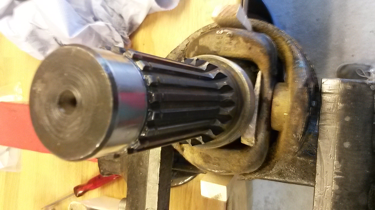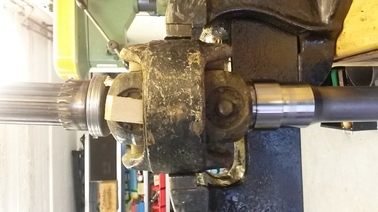 Hier sind noch ein paar Fotos von meiner Reparatur des 416er Vorgeleges. Du kannst darauf kleine Holzkeile erkennen, die ich an verschiedenen Stellen eingesetzt hatte, um das Gelenk zu blockieren (hier allerdings schon beim Zusammenbau der Vorgelege-Eingangswelle), um überhaupt arbeiten zu können. Der Außenkörper des Gelenks dabei hängend in einen Schraubstock eingespannt (Voransichten haben sich beim Hochladen gedreht, sind aber vergrößert korrekt zu sehen):