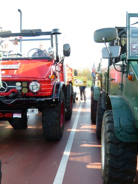 acht Unimog versammeln sich pünktlich um 12 Uhr in Sasbach - in der Hoffnung, dass sich der Nebel bald auflösen möge. Und in der Erwartung am Treffpunkt am Fährhaus in Greffern noch viele weitere Teilnehmer unserer herbstlichen Ausfahrt am Rhein entlang zu treffen.