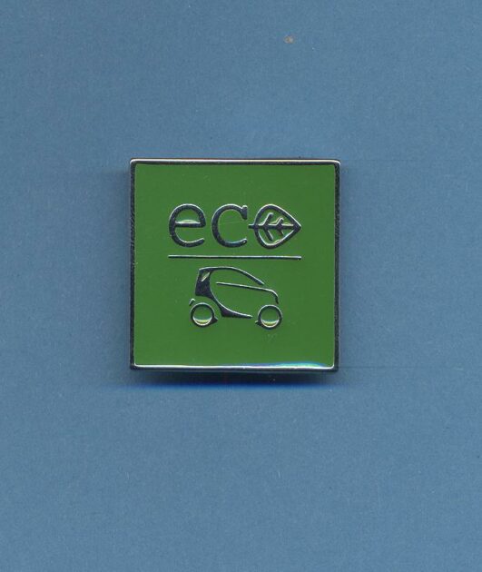 Geprägter Pin, City Coupé in Türkis mit grauer Windschutzscheibe und mit geprägten Mercedes-Stern und Recycling-Zeichen auf der Rückseite Größe: 25,3mm x 17,8mm