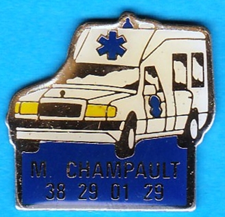 Weißer Krankenwagen mit Beschriftung auf blauem Untergrund: M.CHAMPAULT 38 29 01 29 Größe:25.4mm x 24.2mm