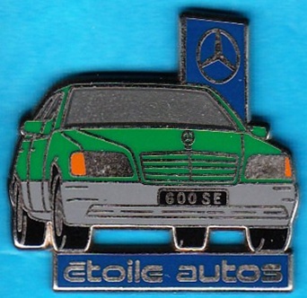 W 140 600 SE in Grün mit Aufschrift :Etoile autos auf blauem Untergrund, Pin ist in Silber Größe:27mm x 26mm