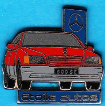 W 140 600 SE in Rot mit Aufschrift :Etoile autos auf blauem Untergrund, Pin ist in Silber Größe:27mm x 26mm