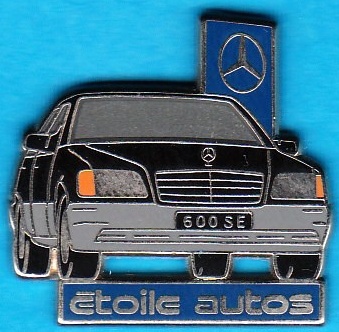 W 140 600 SE in Schwarz mit Aufschrift :Etoile autos auf blauem Untergrund, Pin ist in Silber Größe:27mm x 26mm