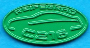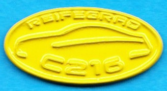 Ovaler Pin mit Silhouette und Beschriftung: REIFEGRAD C216 Auf der Rückseite :Mercedes-Benz Größe:25mm x 12.2mm