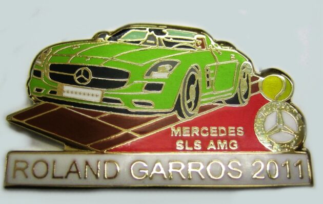 Gelber SLS R 197 mit Stern und Beschriftung: MERCEDES SLS AMG ROLAND GARROS 2011. Abmessung: 29 x 18 mm. Qualitaet: Emaile. Rueckseite: Gold glatt.