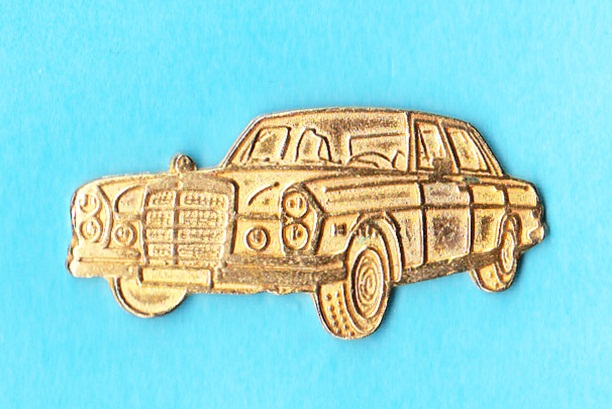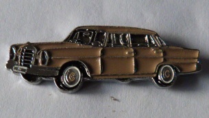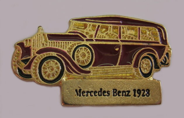 goldfarbener Pin mit rotbraunem Fahrzeug Typ 460 Nürburg 1928 W08, mit Schriftzug unten ” Mercedes Benz 1928″, Rückseite mit Herstellerstempel “BICOCA 4125188” Abm.34×15 mm