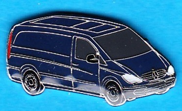 Blauer Viano mit schwarzen Scheiben. Auf der Rückseite die Aufschrift: Mercedes-Benz Größe: 27mm x 14mm