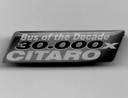 Omnibus Mercedes Citaro Bus of the Decade 30.000 x. Abmessung: 35 x 9 mm. Qualität: Epoxy. Rückseite: Silber glatt.