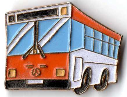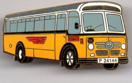 Mercedes-Benz Schweizer Bus mit P 24144. Abmessung: 41 x 23 mm. Qualität: Emaile. Rückseite: Gold glatt mit Kidex Basel.