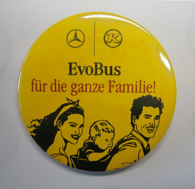 runder Button, der zum Familientag in Neu-Ulm hergestellt wurde. Oben befindet sich neben einem Mercedes Stern ein Kässbohrer Zeichen. Beide sind durch einen senkrechten Strich getrennt. Darunter befindet sich das Wort “EvoBus”. Damit wird auf das neu gegründete Busunternehmen, das aus beiden Firmen hervor ging, angespielt. Darunter steht “für die ganze Familie!” Unten ist ein […]
