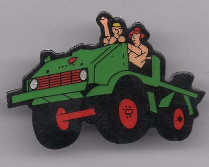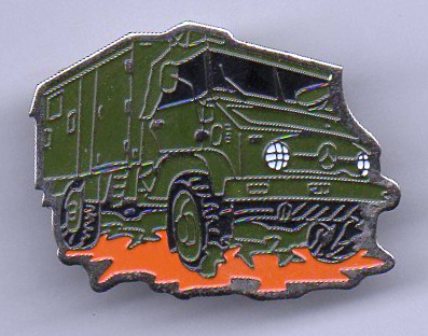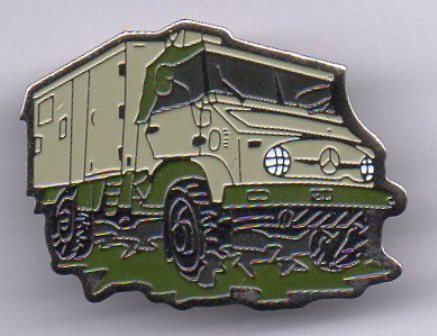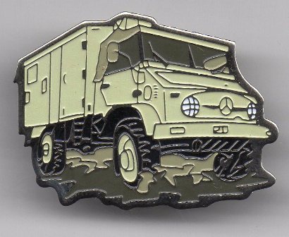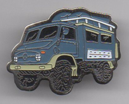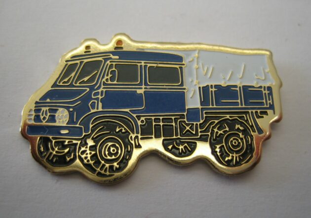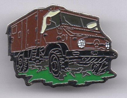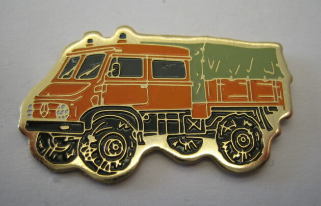 Unimog 404 DoKa mit goldfarbenem Metall;Abm.30x19mm; Teil eines Pinsets, das aus 5 verschiedenfarbigen Pins besteht.Es gibt ein weiteres Pinset mit 5 Pins, mit silberfarbigem Metall und Epoxy-Überzug mit Auflage 20 Stück und ein Pinset mit 3 Pins und silberfarbenem Metall ohne Epoxy mit der Auflage 80 Stück.