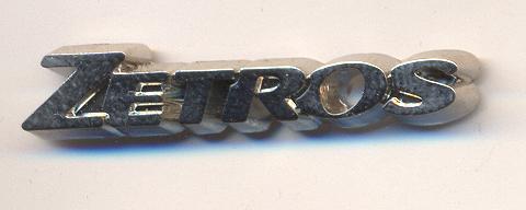 Silberner Pin mit Schriftzug ZETROS auf weißen Untergrund und IAA 2008 Größe:33.5mm x 15mm