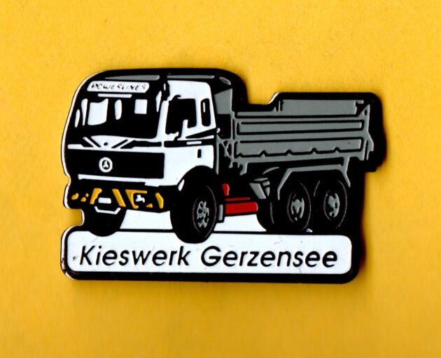 geprägter Pin zeigt Baustellen – LKW mit Führerhaus und Tranportmulde, darunter befindet sich ein Schriftzug “Theler AG”, Abm.ca. 21 x 21 mm