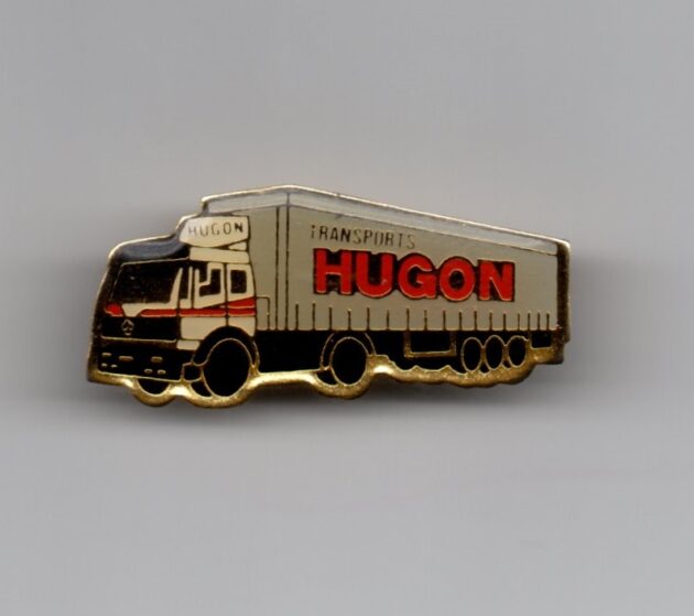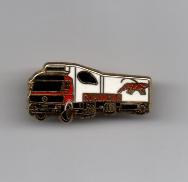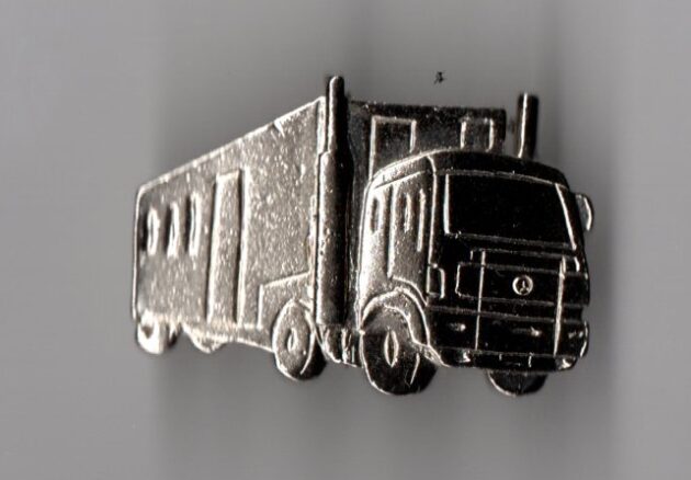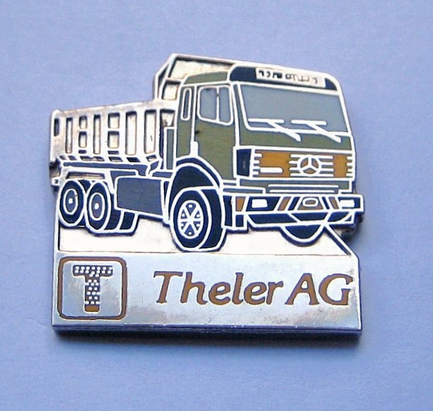geprägter Pin zeigt Baustellen – LKW mit Führerhaus und Tranportmulde, darunter befindet sich ein Schriftzug “Theler AG”, Abm.ca. 21 x 21 mm