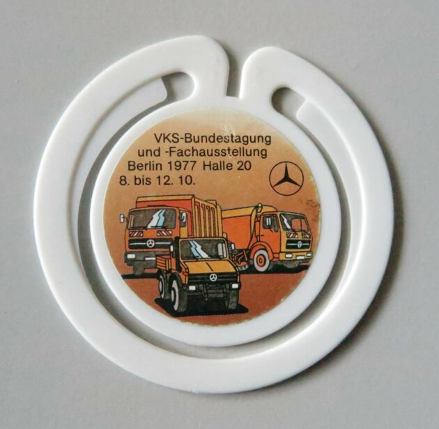 weisser Kunststoffanstecker von der VKS-Bundestagung in Berlin. (Verband der Kommunalen Entsorgungswirtschaft) In der Mitte sind 3 Kommunalfahrzeuge und ein schwarzer Mercedes Stern abgebildet. Abm. Ø 8 cm