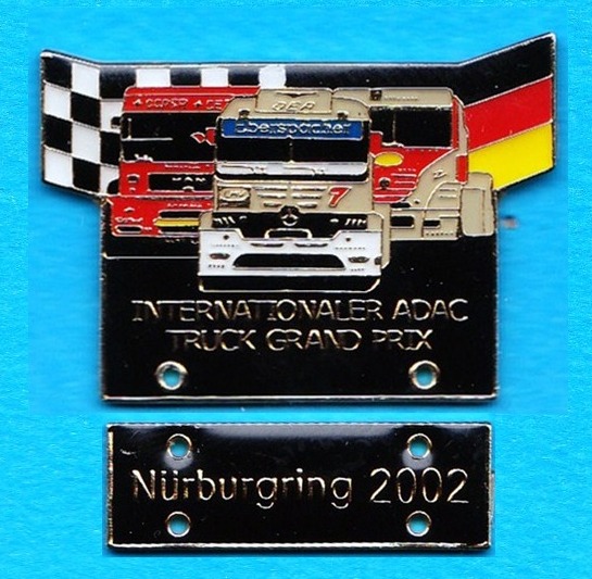 Pin mit Anhänger : INTERNATIONLER ADAC TRUCK GRAND-PRIX Nürburgring 2002 Größe:39mm x 24mm – 32mm x 10.5mm Hinten: 2 Pins; Messing geriffelt; M8 Print