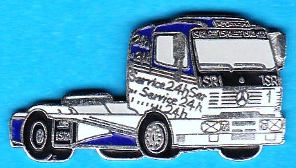 Weiß/Blauer Renntruck mit der Nr.1 und Beschriftung: SRI Service 24h Größe:34mm x 18mm