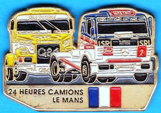 COUPE D EUROPE LE MANS 1993 mit drei Renntrucks,der Linke ist der Mercedes in Weiß/ROT . Größe:44mm x 27mm