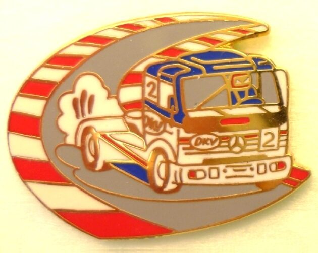 Renntruck rot weiß mit Fahne; Größe 30×30.geprägt.