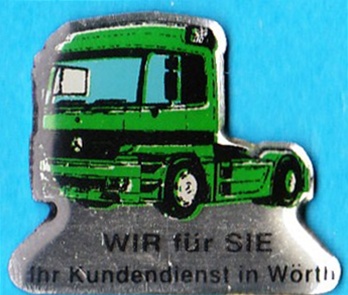 Grüne Zugmaschine mit schwarzer Schrift auf silberem Untergrund:WIR FÜR SIE,Ihr Kundendienst in Wörth Größe:26mm x 23mm