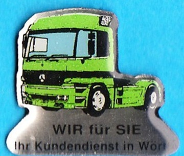 Hellgrüne Zugmaschine mit schwarzer Schrift auf silberem Untergrund:WIR FÜR SIE,Ihr Kundendienst in Wörth Größe:26mm x 23mm