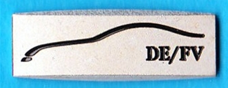 Silberner Pin aus dem Design-Bereich mit schwarzer Silhouette und der Abteilungbezeichnung : DE/FV Abmessung:25mm x 8.6mm