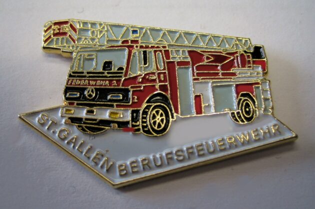 SK rotes Feuerwehrfahrzeug mit Leiter, unten steht auf weißem Hintergrund “St.Gallen Berufsfeuerwehr. Abm.33x20mm, Rückseite mit Herstellerzeichen
