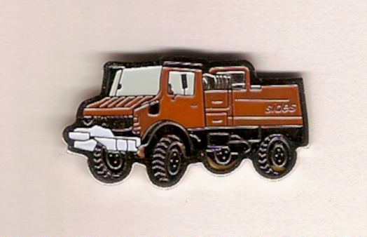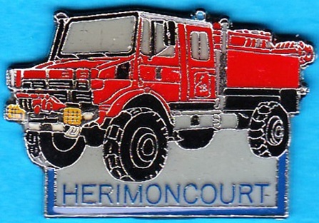 Unimog der Feuerwehr HERIMONCOURT aus Frankreich. ( Hintergrund ist in Grau,Rahmen und Beschriftung sind in Blau ) Größe 35mm x 25mm