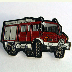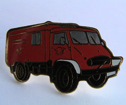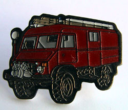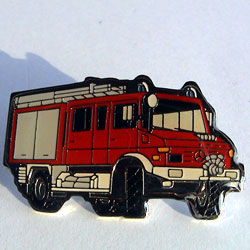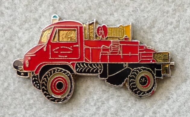 Unimog-S, 404, Feuerwehr, mit Posthorn auf Beifahrertür, 30 mm. Pin wurde mit drei weiteren Pins als Set angeboten. Rückseite goldfarben, geriffelt