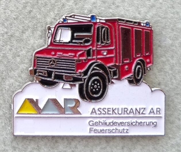 Unimog Feuerwehr Assekuranz AR – Gebäudeversicherung, Feuerschutz in Appenzell, 30 mm lang. Rückseite silberfarben, fortlaufend nummeriert
