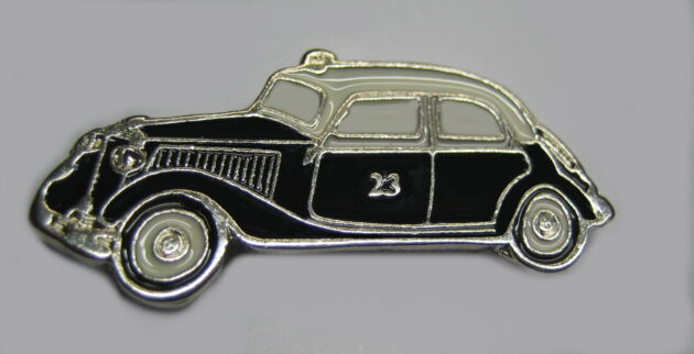Blauer Pin mit silberner E-Klasse Taxi und Beschriftung: CHRISTEN-LERCH 89 63 87 87 Größe:23mm x 17.5mm