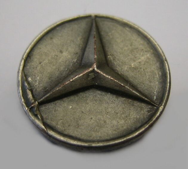 Knopf mit erhabenem Mercedes-Benz Stern aus Leichtmetall. Auf der Rückseite steht:”INDUSTRIA ARGENTINA”, Ø 15mm